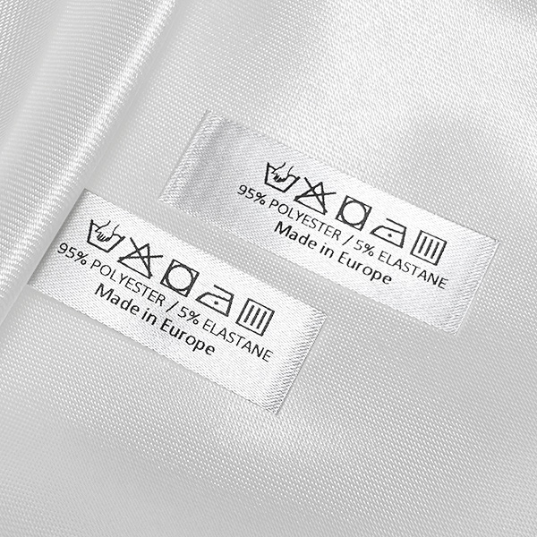 Etiqueta têxtil, com símbolos de lavagem e manutenção, para ser costurada na roupa, personalizada com os dados sobre a composição do material e o país de fabricação. Este tipo de etiqueta têxtil é feito usando as tecnologias mais avanças no campo de impressões digitais num suporte têxtil. As etiquetas são impressas num cetim especial através do método de transferência térmica, com uma qualidade de impressão impressionante e alta resistência à lavagem.