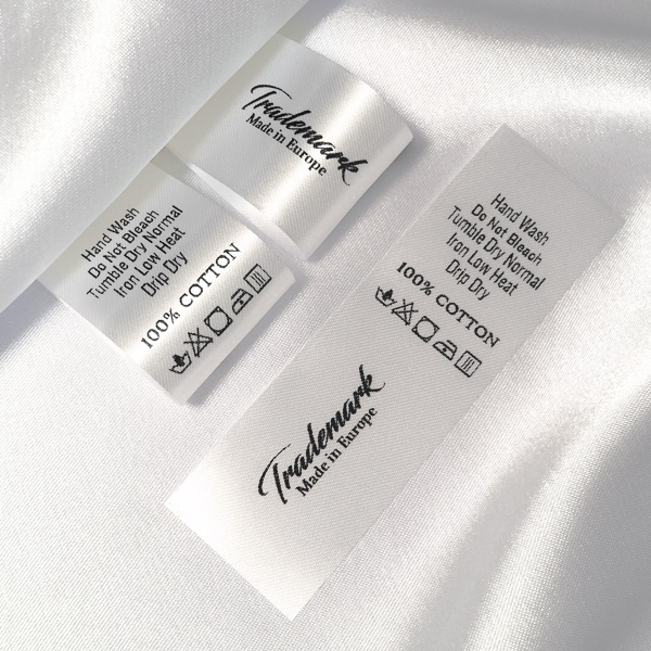 Etiqueta de cuidados de lavagem de roupa, impressa digitalmente com escrita preta em cetim branco, ideal para vários artigos de vestuário. Este tipo de etiqueta têxtil é feito usando as tecnologias mais avanças no campo de impressões digitais num suporte têxtil. As etiquetas são impressas num cetim especial através do método de transferência térmica, com uma qualidade de impressão impressionante e alta resistência à lavagem.