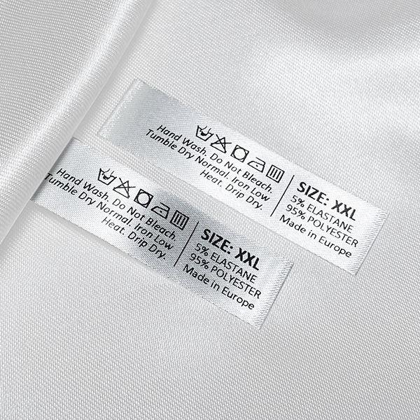 Etiqueta de cetim personalizada para etiquetar roupas com informações sobre cuidados e manutenção, incluindo símbolos de lavagem, composição e tamanhos. Este tipo de etiqueta têxtil é feito usando as tecnologias mais avanças no campo de impressões digitais num suporte têxtil. As etiquetas são impressas num cetim especial através do método de transferência térmica, com uma qualidade de impressão impressionante e alta resistência à lavagem.