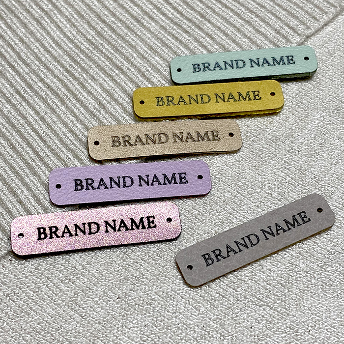 Etiqueta personalizada EP-M126 produzida em couro sintético para vestuário, malas, sapatos e vários acessórios de vestuário.