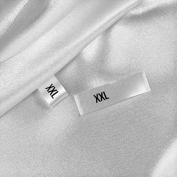 Etiqueta de tamanho para coser de forma dobrada numa peça de roupa, feita de material têxtil fino. Este tipo de etiqueta têxtil é feito usando as tecnologias mais avanças no campo de impressões digitais num suporte têxtil. As etiquetas são impressas num cetim especial através do método de transferência térmica, com uma qualidade de impressão impressionante e alta resistência à lavagem.