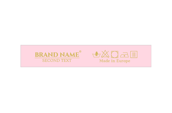 Etiqueta de cuidados de lavagem personalizada com símbolos de lavagem e o nome da marca ou logo, adequada para qualquer produto têxtil, especialmente artigos de vestuário. Este tipo de etiqueta têxtil é feito usando as tecnologias mais avanças no campo de impressões digitais num suporte têxtil. As etiquetas são impressas num cetim especial através do método de transferência térmica, com uma qualidade de impressão impressionante e alta resistência à lavagem.