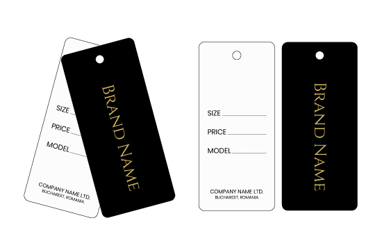 Conjunto de 2 etiquetas de cartão fornecidas com selo com fio para pendurar para roupa e acessórias de vestuário, feita de cartão plastificado grosso e impresso com texto dourado e preto. Este tipo de etiqueta pendurada é feita de materiais de alta qualidade, usando as tecnologias mais avançadas no campo de impressão e acabamento Digital.