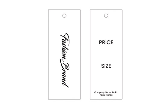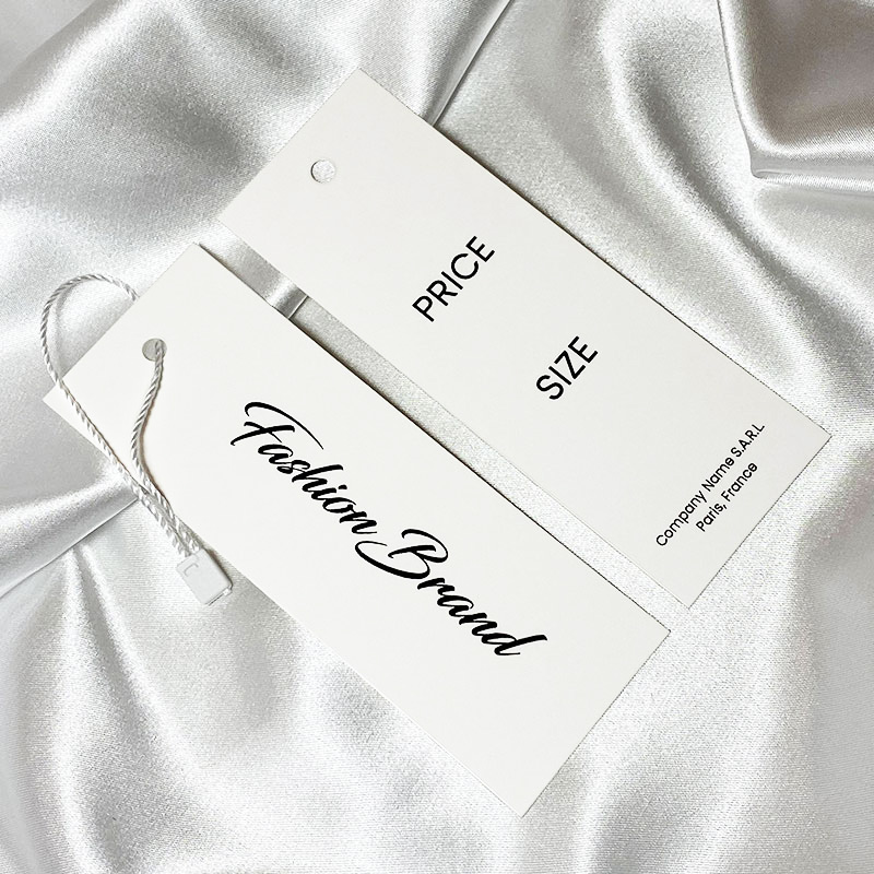 Etiqueta do produto em papelão personalizado, fornecida com cordão branco para pendurar na roupa, personalizada com texto e logotipo do fabricante nas duas faces. Este tipo de etiqueta pendurada é feita de materiais de alta qualidade, usando as tecnologias mais avançadas no campo de impressão e acabamento Digital.