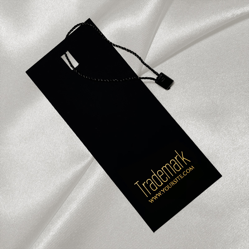 Etiqueta de cartão para roupa incluindo selo com fio de poliéster para fixação de modelo HT-M108, feita de cartão preto grosso personalizado com texto dourado ou logo. Este tipo de etiqueta pendurada é feita de materiais de alta qualidade, usando as tecnologias mais avançadas no campo de impressão e acabamento Digital.