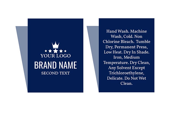 Etiqueta tecida personalizada dobrada no meio bordada num suporte têxtil modelo Majestic Style, personalizada com indicador de tamanho, nome da Marca, texto da composição e manutenção e um logo/emblema. Este tipo de etiqueta bordada é feito de materiais de alta qualidade, usando as tecnologias mais avançadas do campo de bordado digital a um nível industrial.