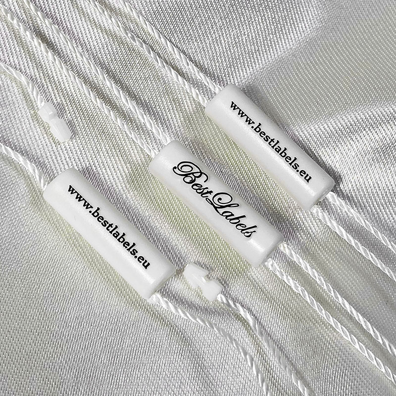 Selo de plástico ST-M242 com um design elegante com uma forma cilíndrica personalizado com o nome da marca, ideal para produtos como roupa de mulher e homem, calçado, joelharia, relógios, etc. Este tipo de selo é feito de materiais de alta qualidade usando as tecnologias mais avançadas na área.