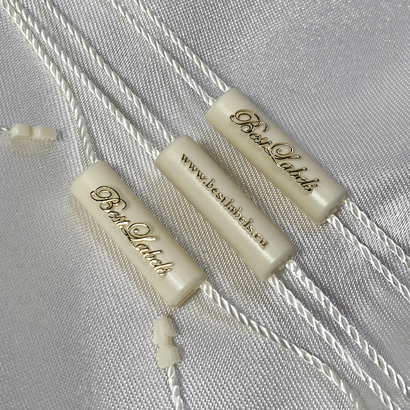 Selo de plástico ST-M244 com um design elegante com uma forma cilíndrica personalizado com o nome da marca, ideal para produtos como roupa de mulher e homem, calçado, joelharia, relógios, etc. Este tipo de selo é feito de materiais de alta qualidade usando as tecnologias mais avançadas na área.