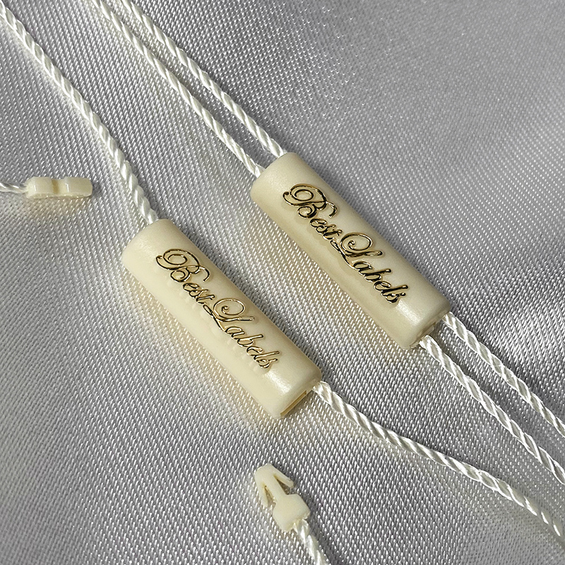 Selo de plástico ST-M248 com um design elegante com uma forma cilíndrica personalizado com o nome da marca, ideal para produtos como roupa de mulher e homem, calçado, joelharia, relógios, etc. Este tipo de selo é feito de materiais de alta qualidade usando as tecnologias mais avançadas na área.