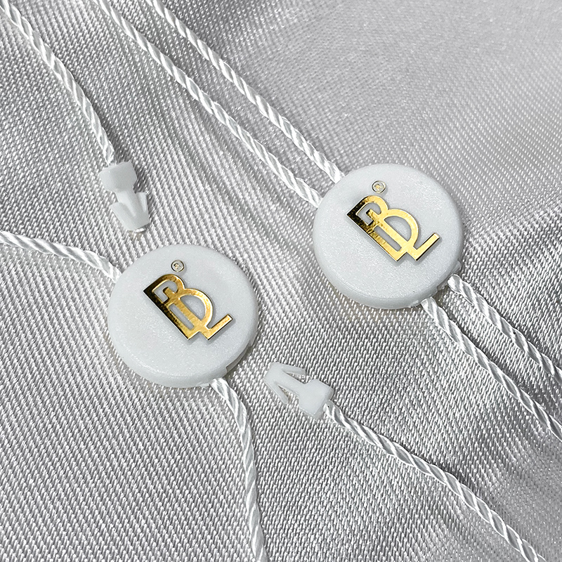 Selo de plástico ST-M34 com forma redonda, personalizada com um logo/emblema e texto/expressão curta, adequada para vários produtos, como: roupa, sapatos, malas, joalharia e vários acessórios. Este tipo de selo é feito de materiais de alta qualidade usando as tecnologias mais avançadas na área.