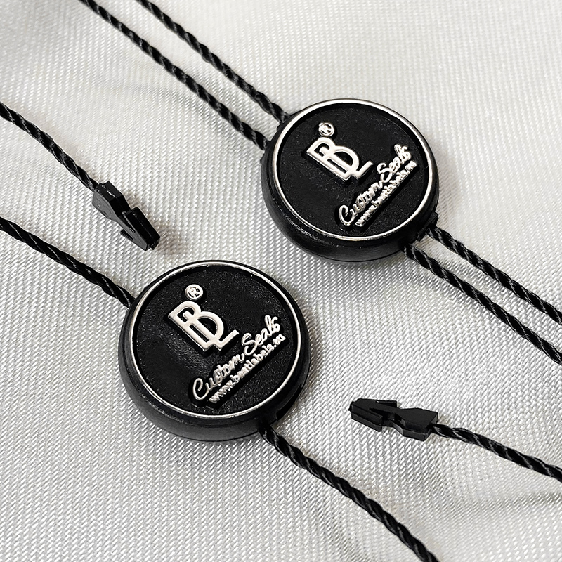 Selo de plástico ST-M86 com uma forma redonda, muito elegante e lindamente personalizado em ambos os lados com o nome da marca ou emblema, adequado para roupa, sapatos, malas, etc. Este tipo de selo é feito de materiais de alta qualidade usando as tecnologias mais avançadas na área.